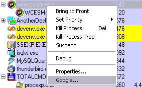Oglądając dzisiaj program Process Explorer zauważyłem ciekawą opcję w menu kontekstowym — „Google” (rys.1) służącą do uruchomienia wyszukiwania informacji na temat wybranego procesu (wg nazwy).